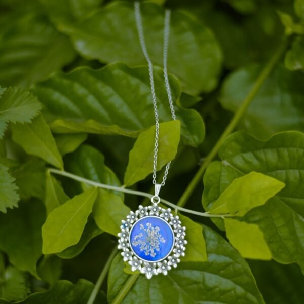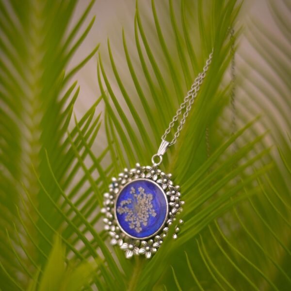 Carry a bloom of nature wherever you go. This handcrafted floral pendant captures a real dried flower in shimmering blue resin—making it a poetic keepsake for everyday elegance or heartfelt gifting.